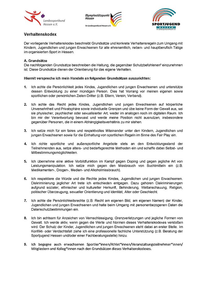 Der Verhaltenskodex und die Verhaltensregeln zum Kindeswohl (Anlage Ex. LSBH) wurden von allen in der Jugendarbeit tätigen Trainern und Betreuern unterschrieben.
